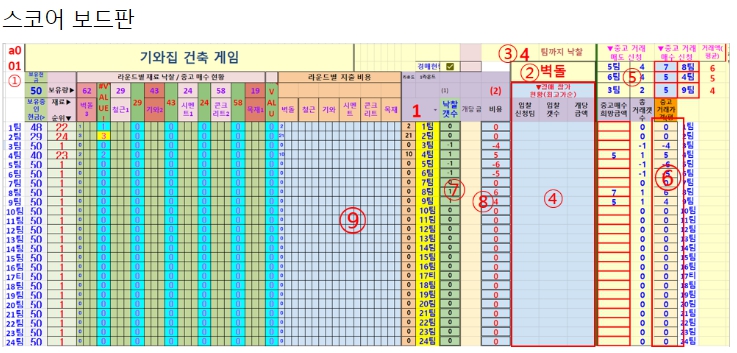 5. 남은 수량이 (-)가 되는 경우는 누군가가 확보해야하는 수량보다 더 많이 확보했기 때문입니다. 즉 벽돌이 4개만 있으면 되는데 매 차시에 2개씩 총 6개를 확보했다면 벽돌 수량이 (-)가 되게 됩니다. 1~2명이 그렇게 하더라도 (-)가 되지 않지만 더 많은 인원이 초과 구매하게 되면 남은 수량이 (-)가 됩니다. 이 경우에는 강제 구매 비용이 50으로 올라갑니다. 이런 전략을 펼치는 Player는 자신이 초과 구매로 약간의 손해를 보더라도 남은 수량을 (-)로 만들어 확보하지 못한 사람에게 강제 구매로 큰 손해를 입히게 하고자 할 때 사용합니다.
